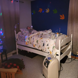 Below is Greyson's bath chair, Wonderfold Wagon, Wheelchair, his Lightz of Hope light, the oxygen condenser, his starlight projector